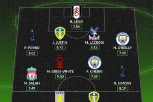 24直播网4月22日讯 whoscored统计了本轮英超评分最佳阵容,曼城、热刺、利兹联各2将入围。